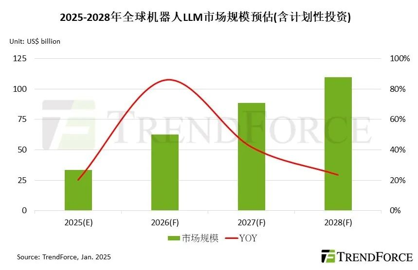 Trendforce集邦咨询发布的最新研究报告指出,随着人类机器人技术的高度系统集成,预计将从工业场景扩展到家庭生活,前端人工智能(AI)训练将变得至关重要。预计到2028年,全球机器人大型语言模型,包括人工智能培训和生成内容解决方案(LLM)总市场规模将超过1000亿美元,2025年至2028年复合年增长率将达到48.2%。