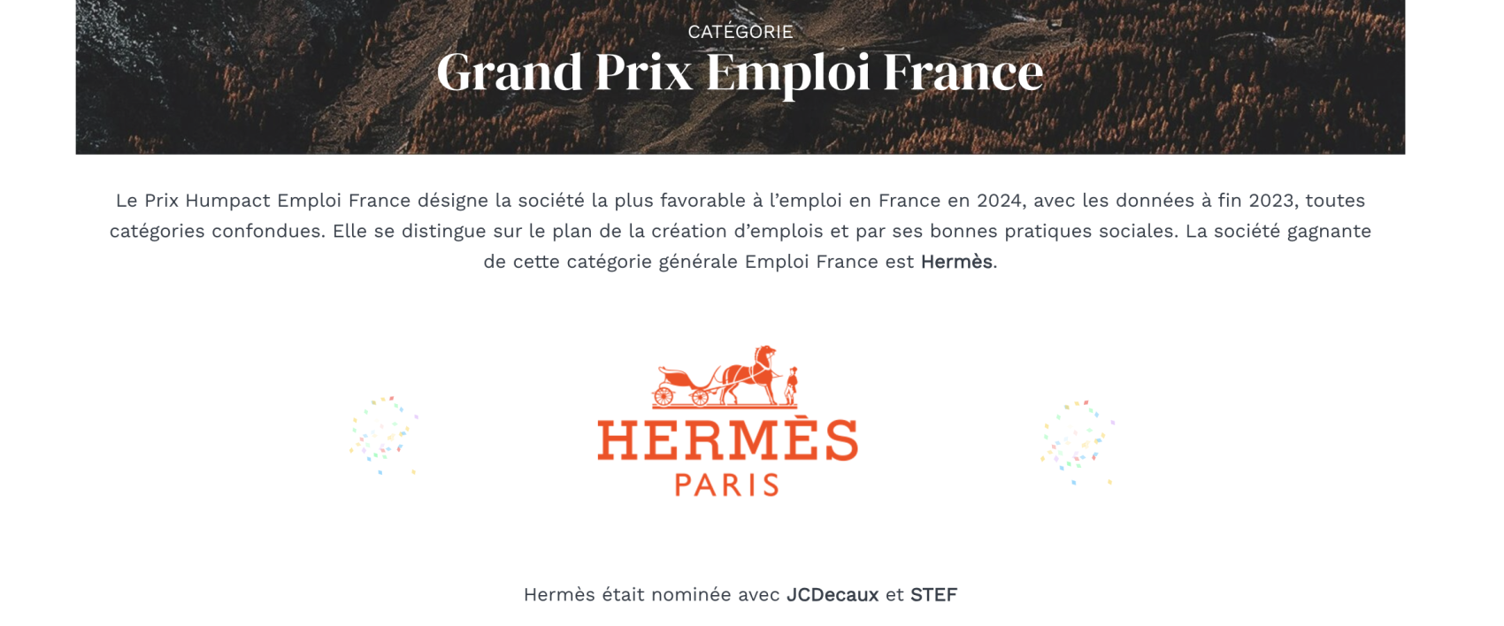 日前,法国奢侈品牌爱马仕(Hermès)第四年荣获金融评级机构 Humpact 颁发的法国就业创造最高奖(Emploi Grand Prix en France)。此前,爱马仕曾于 2020 年、2021 年和 2023 年获得这一奖项。